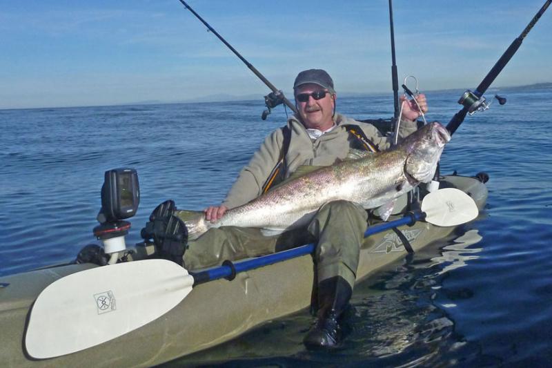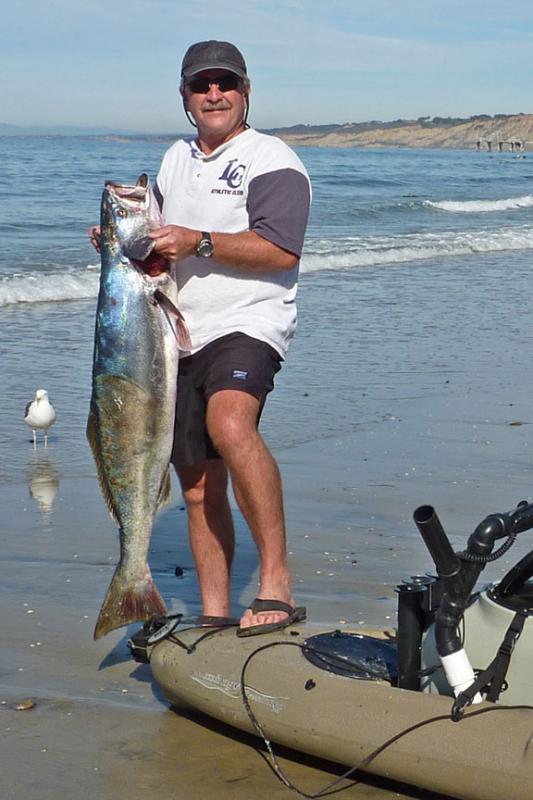 I arrived a little late to the launch on New Year’s Day. As I peddled past Eric with his beautiful WSB strapped to the back of his kayak, I was encouraged and hopeful that my day might end up in a similar fashion. I had not been on the water for more than a month and had missed the big bite that occurred in mid December. Based on all the chatter I had picked up, I figured that my best chance for success on this day would be yo-yoing some iron. So that is what I did. No love. About an hour in, I ran across the Darkhorse, making bait. I asked him if he was planning to fish with bait. His typically cryptic response was that he wanted to have some bait on hand, “just in case”. That seemed reasonable to me so I decided to do the same. My first fish of the year was a 6” Spanish mackerel. Would this be my largest catch of the day? At least I was catching something so I filled the tank with a dozen or so macks, including a few greenies. By this time most of the dawn patrol had given up and gone in empty handed. There were only a couple of us remaining along with several PBs. The weather was spectacular as I watched a couple gray whales cruise through the fishing grounds. I pinned on one of the greenies along with a slip sinker and sent my bait to the bottom. After about 15 minutes of slow trolling, my bait started getting nervous. There was a bump, then another and then suddenly my line started peeling off the reel. I put the reel in gear and was rewarded. FISH ON! I knew that it was big, but what kind? This fish fought hard. At first there were some very strong runs with a few angry head shakes thrown in. There were many minutes where we were at a stand-off. The fish was no longer taking line but I could not gain any ground either. About fifteen minutes into the battle, I was able to start making headway and retrieving some line. It started slowly but then became easier. At times, it felt like I was hauling up dead weight, like a big chunk of kelp. Suddenly, the fish got new life. The reel was screaming as this thing headed for the bottom again. Then, just as suddenly the run stopped and I was reeling up dead weight again. What in the world had I hooked? We played this game a couple more times until about twenty minutes into the fight, I saw color. It was big. Easily the biggest fish I had ever hooked. Could I land it? All of a sudden, there was hardly any resistance. I could still see the fish was still hooked but the fight was over. I quickly reeled in the last 25 feet and when the fish came to the surface, it rolled belly up. Catching a fish this big is new to me but I was fairly certain that in most cases getting the fish to the boat was only half the battle. I would have to carefully aim my gaff strike and hope that the fish would stunned enough so I could haul it onto my kayak. Not this time. As Jay, the lone other kayker in the area closed in to check out the action, I simply grabbed this beauty by the gills and lifted it onto my lap. There was no need to use the gaff or even a club. I had landed my first White Sea Bass. With Jay’s help, we secured the fish to the game clip and strapped it to the back of my Revo. I have no idea how I would have been able to accomplish this by myself. Thanks Jay for coming to my rescue and for the great photos. This fish tipped the scales at 38 pounds. It was not only my first WSB but the largest fish I have ever caught. For a few short hours, it was probably the largest fish caught this decade in La Jolla. As I peddled in, I noticed that the Darkhorse was still out there fishing so I am sure that this record did not last very long. Attachment 1806 Attachment 1807 What a way to start off the new year. Bob |