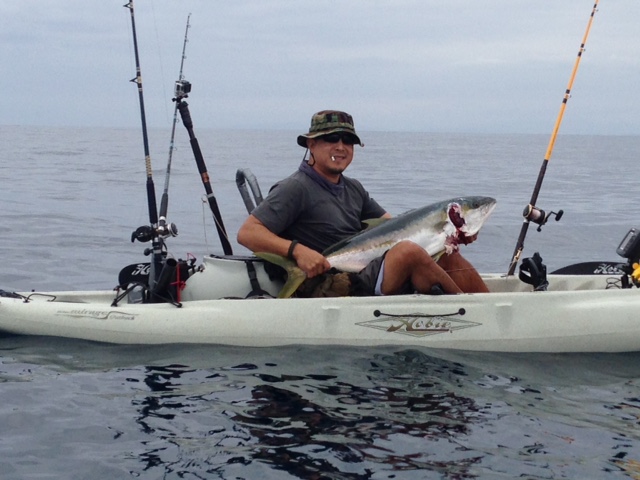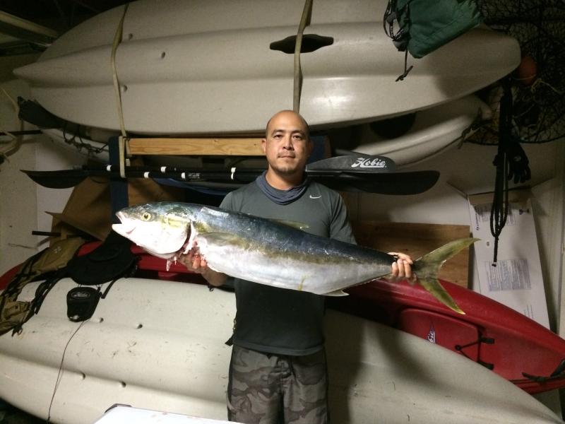 10/31 Treat! Took Dad out for his first LJ trip. On the way out we had reports of cold water, not much fish, and lots of seals. Launch was a breeze. Took about an hour making bait but we found nice mid size macks. Plenty of bait schools running around but took me forever... I set dad up and then set my bait out in about 90feet. I dont think I was in the water for 10 mins when the clicker went off. I told dad not to yell out (and attract seals) if he hooked up, but I didn't want to lose dad the second we got out there, so here I go.."I'm on I'm on!" The fish headed to open water so I just let him run himself out. Lots of line lost with 3 good runs. I had him under the boat and dad was behind me and yelled "The seals right behind you!" I dropped the pole to the water and tried to play dead but he wasn't falling for it. I even tried to throw out some bait to distract him but he was on the fish. Next thing I know he pops up next to the boat with a large yellow but my line is still straight down in the water. It turned out my line was around kelp deep and he had pulled it up from the other side. The kelp eventually popped and I figured out the deal. It was a smaller seal and he was having a hard time getting a hold of the fish. He had taken a large bite of a cheek and the collar. Since it was a smaller seal I didn't give up, tugged it out, and sunk the gaff. My fish! 41" at the fork. 45" total. Skinny. Didn't have a scale. Guessing around 30+lbs. My first LJ yellowtail. I cut way around the seal bit stuff near the collar and the rest is in the freezer.