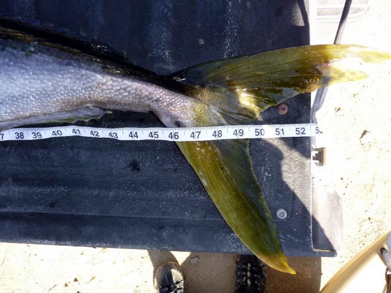 I got out twice over the week end only to be blown off by 9 am We were having a Santa Ana wind event here much like you were having up there, which resulted in my first 2 skunks on the yellows since I've been here. I decided to hit it again on Monday as the wind laid down nicely overnight. Monday morning was one of those perfect days. Greasy calm and warm. Decided to drive over to San Roque to launch where I caught a 34+ pounder on the previous Monday. Launched at about 6:30 and paddled to the waypoint where I scored last Monday, about a mile and a half. Landed on my waypoint and started throwing my blue and white Salsa and on about the 6th cast stuck this beauty. It is a new personal best for me coming in at 50 inches at the fork and weighing 47.8 lbs, including the game clip. It was quite a fight and it totally kicked my butt. He attacked my jig about mid column in about 110 ft of water but made a good run to a rocky high spot not far away in 75 ft of water. My job became to just keep him off the bottom if possible. There was one point where I felt him wrapped on something on the bottom but I gave him a little slack line and he swam out of it. I was not planning on keeping anything today as my freezer is still pretty well stocked from last Monday. When I saw him at deep color he looked massive and I checked my sonar and he was still at 25 feet. That's when I got my gaff at the ready. One of the local pangas was driving by and stopped to watch the last 5 minutes of the fight and when I stuck him they really whooped it up, even more than I did. "Grande Grande!" I took a couple pictures and tried to get a measurement on it and tried to give it to the pangeros but they were going to be out all day and could not keep something that size fresh on a hot day. Glad they didn't because my OTW shots sucked.